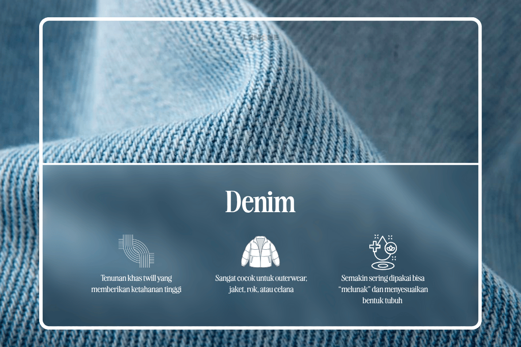 Denim adalah kain katun dengan tenunan khas twill yang memberikan ketahanan tinggi.