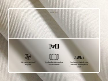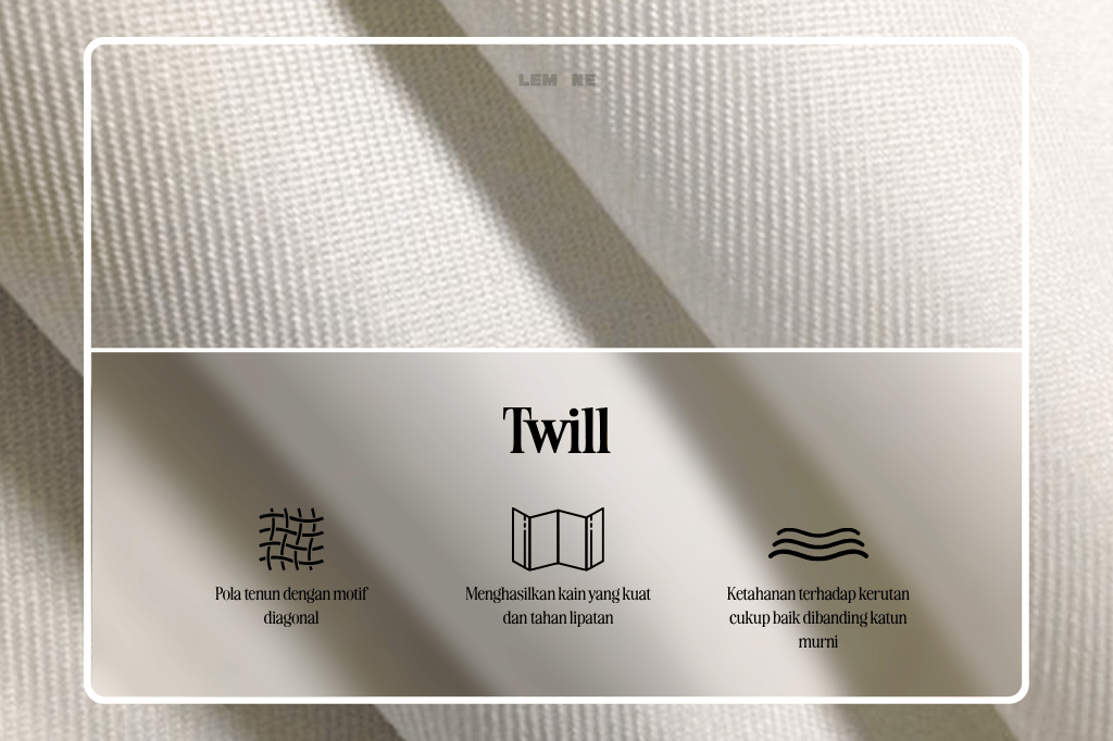 Twill adalah pola tenun dengan motif diagonal, menghasilkan kain yang kuat dan tahan lipatan.