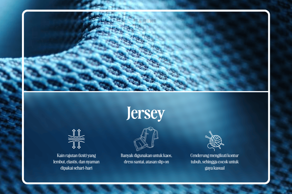 Jersey adalah kain rajutan (knit) yang lembut, elastis, dan nyaman dipakai sehari-hari.