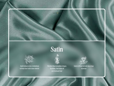 Satin bukan serat, melainkan teknik tenun satin (satu sisi mengkilap). Bisa terbuat dari sutra (silk satin) atau sintetis (polyester satin).