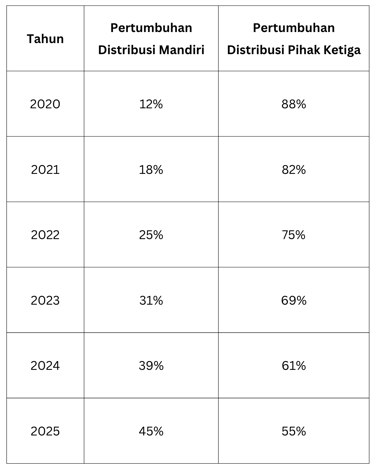 Dari tabel tersebut terlihat bahwa tren distribusi mandiri di sektor fashion Indonesia terus meningkat setiap tahun. Semakin banyak brand lokal yang mulai berinvestasi di sistem distribusi internal karena terbukti lebih efisien, lebih terkendali, dan lebih mampu menjaga kualitas produk.