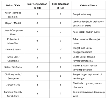 Kami juga menyisipkan data dan tabel agar penjelasan ini tidak sekadar teori. Harapannya, calon reseller, butik, dan fashion wholesalers yang kritis bisa menggunakan panduan ini sebagai acuan memilih bahan terbaik untuk lini produk mereka sendiri.