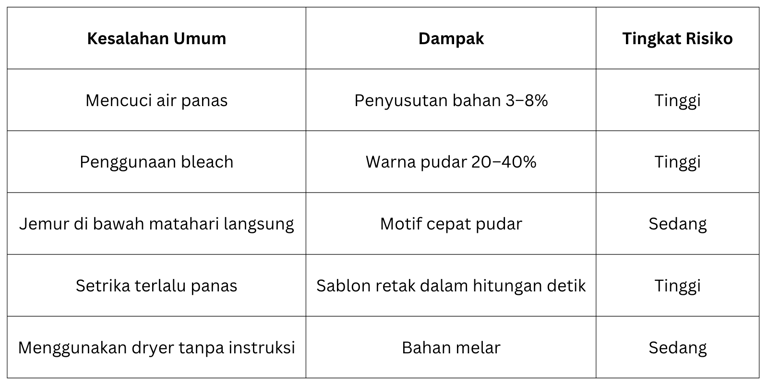 Uji material Printing Wear Test 2023 menemukan bahwa printing sablon bisa retak dalam empat detik jika terkena suhu setrika terlalu tinggi. Tidak heran, banyak orang tua mengira sablon cepat rusak, padahal sering kali karena overheat.