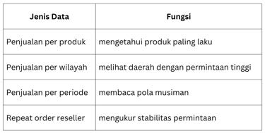 Dalam praktiknya, data penjualan yang digunakan oleh distributor biasanya tidak hanya satu jenis. Beberapa jenis data yang sering dianalisis antara lain: