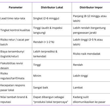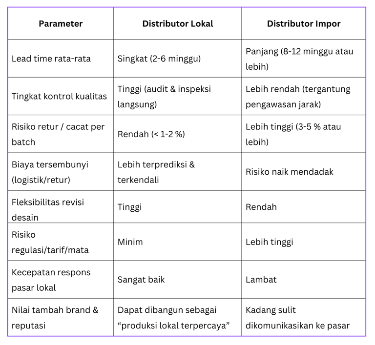 Dengan tabel tersebut, kamu sebagai fashion buyer, brand owner, atau reseller dapat melihat secara singkat bahwa distributor lokal memberikan keunggulan strategis yang seringkali lebih penting daripada selisih harga awal.