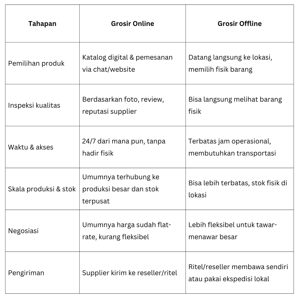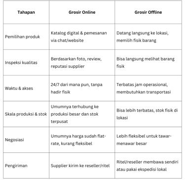 Dari proses di atas, bisa terlihat bahwa untuk usaha yang ingin efisiensi waktu dan akses, model fashion grosir online lebih unggul. Sedangkan untuk usaha yang ingin memeriksa secara fisik dan memerlukan fleksibilitas tawar-menawar atau ingin segera ambil barang, model offline tetap punya ruang.